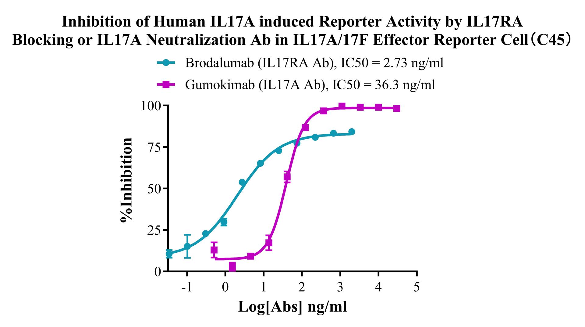Figure 3. Inhibition of Human IL17A induced Reporter Activity by IL17RA Blocking or IL17A Neutralization Ab in IL17A/17F Effector Reporter Cell(C45).