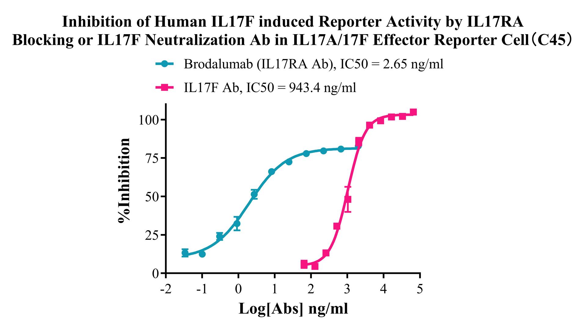 Figure 4. Inhibition of Human IL17F induced Reporter Activity by IL17RA Blocking or IL17F Neutralization Ab in IL17A/17F Effector Reporter Cell(C45).
