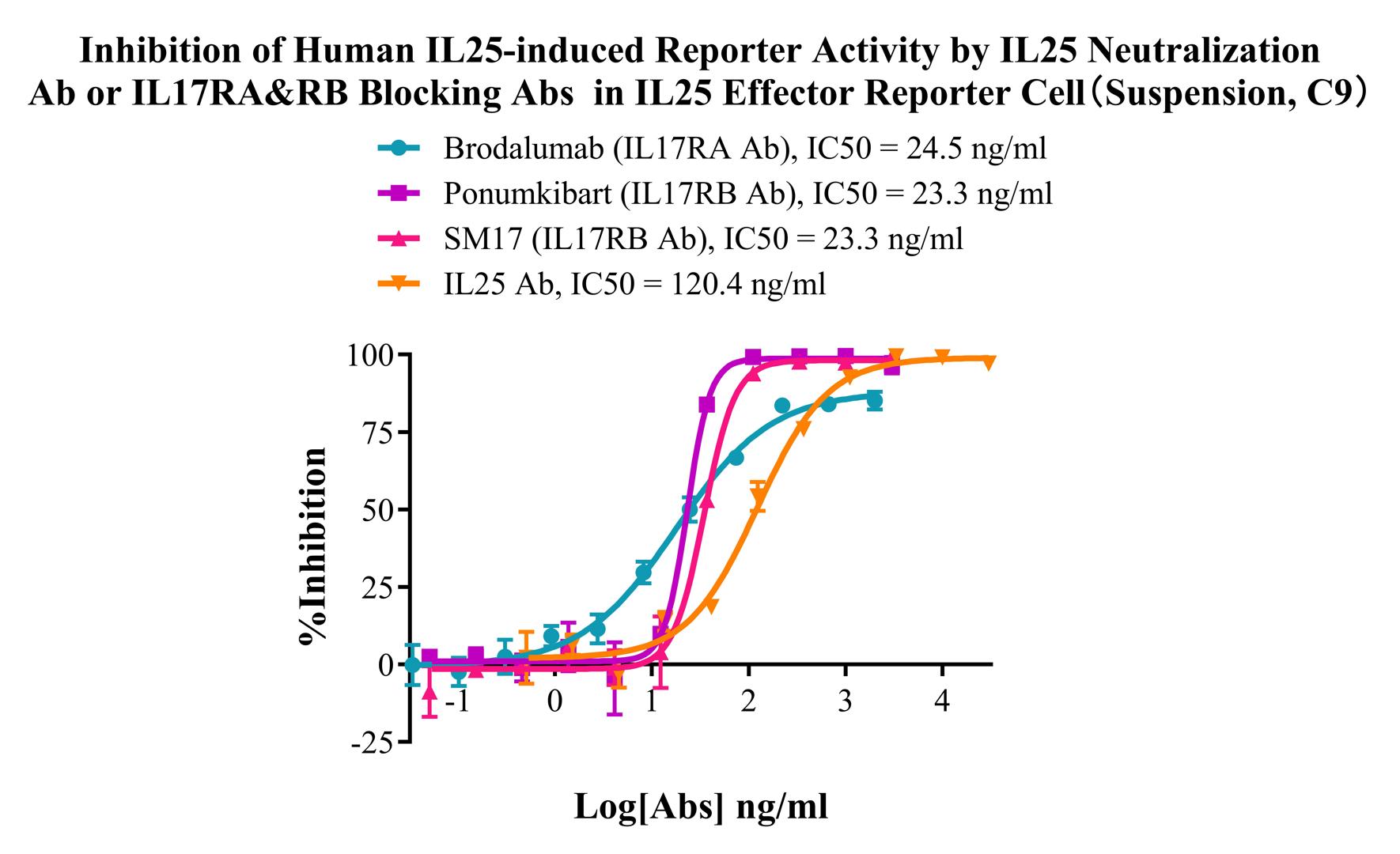 Figure 7. Inhibition of Human IL25-induced Reporter Activity by IL25 Neutralization Ab or IL17RA&RB Blocking Abs in IL25 Effector Reporter Cell (Suspension, C9).