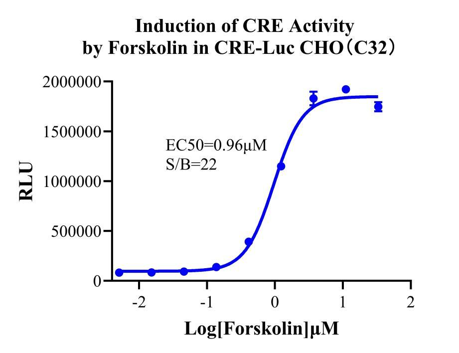 The CRE-Luc CHO-K1 reporter cell line consists of CHO-K1 cells in which the expression of the Luciferase (Luc) reporter gene is under the transcriptional control of the CRE. Forskolin is a naturally occurring compound that acts as a direct activator of adenylyl cyclase (AC), thereby stimulating the cAMP/CREB signaling cascade; the underlying mechanism is illustrated in the figure below.