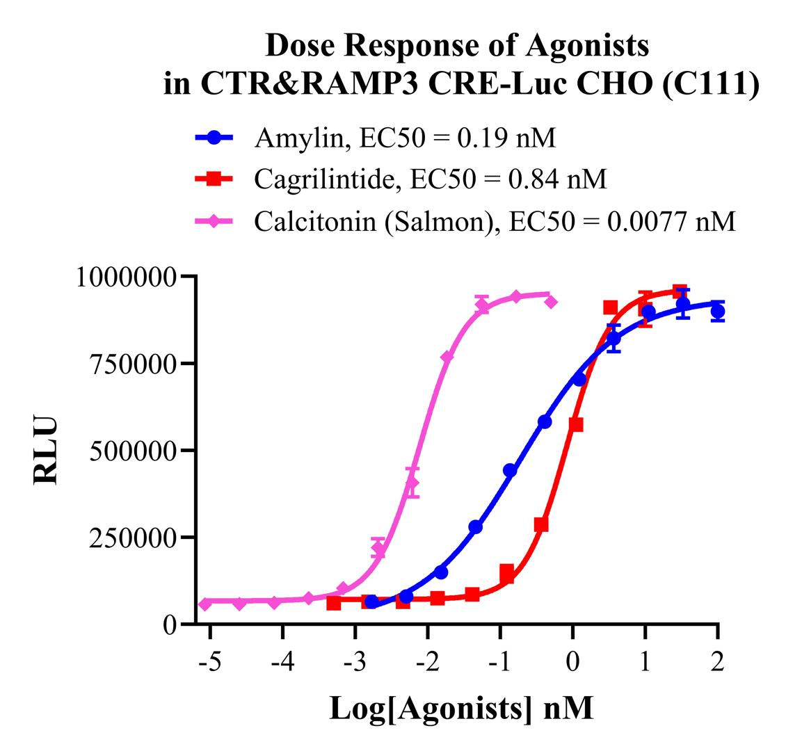 Figure 3. Detect Luciferase assay by Ultra Luciferase Detection Kit RQPH0001(we strongly suggest to purchase from Reqbio). Dose Response of Agonists in CTR&RAMP3 CRE-Luc CHO-K1 (C111).