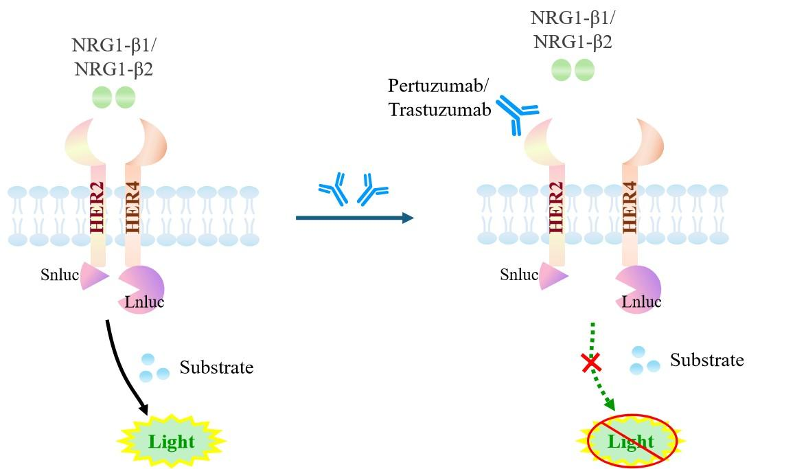 The ERBB2 & ERBB4 Dimerization CHO Reporter Gene Drug Target Model effectively simulates the *in vivo* signal transduction processes involving ERBB2 and ERBB4. The underlying principle is illustrated in the accompanying figure.