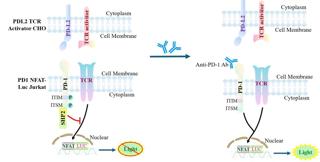The CHO-K1 Human PDL2/TCR Activator Cell Model—effectively simulates the signal transduction process of PD1&PDL2 *in vivo*. The underlying principle is illustrated in the figure below.