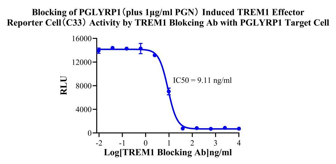 Figure 2. Blocking of PGLYRP1 (plus 1μg/ml PGN) Induced TREM1 Effector Reporter Cell(C33) Activity by TREM1 Blokcing Ab with PGLYRP1 Target Cell .