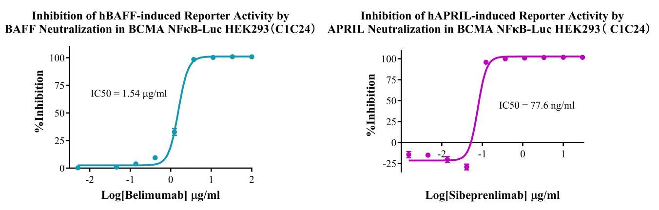 Figure 4. Inhibition of Human hBAFF-induced Reporter Activity by BAFF Neutralization in BCMA NFκB Luc HEK293 (C1C4).Inhibition of hAPRIL-induced Reporter Activity by APRIL Neutralization in BCMA NFκB Luc HEK293(C1C4).