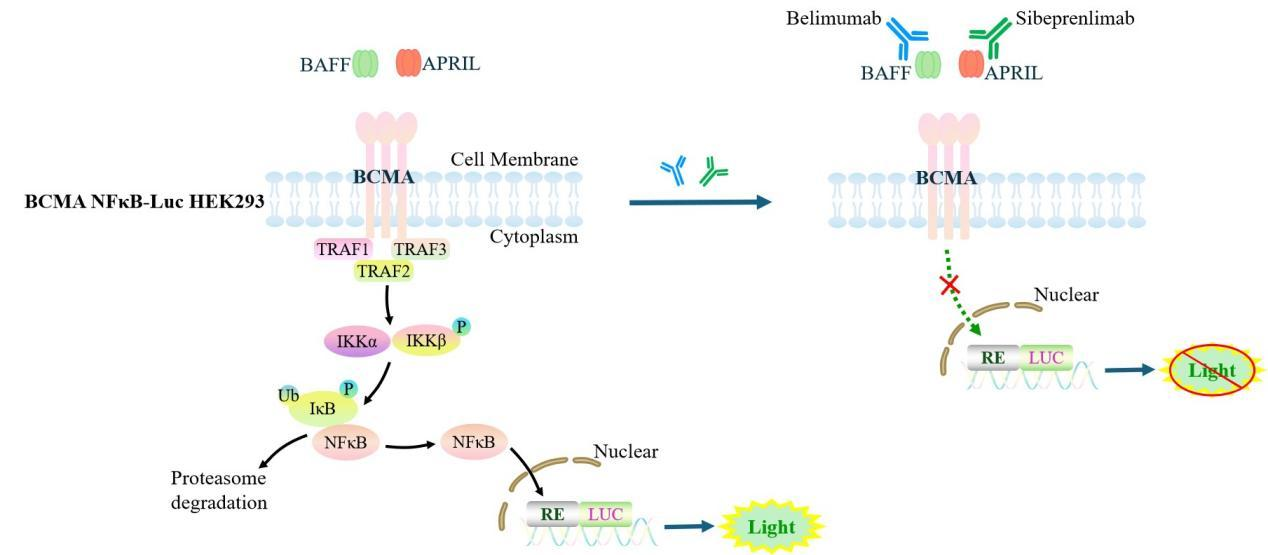 The HEK293 Human BCMA/NFκB-Luc Cell model effectively mimics the in vivo BCMA signaling transduction process. The principle is illustrated in the figure below.
