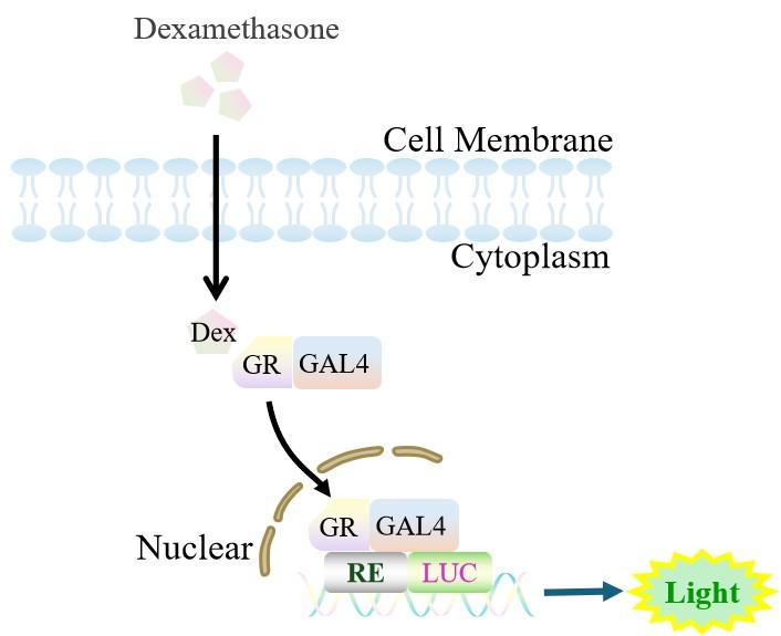 HEK293 cells regulated by GR-GAL4 and expressing the Luc luciferase reporter gene. Dexamethasone (Hexadecadrol) is an agonist of the Glucocorticoid Receptor and an apoptosis inducer; the underlying principle is illustrated in the figure below.