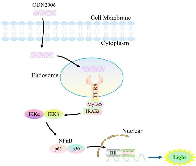 The TLR9 NF-κB-Luc HEK293 reporter gene model accurately recapitulates the *in vivo* signal transduction process of TLR9; the underlying principle is illustrated in the figure below.