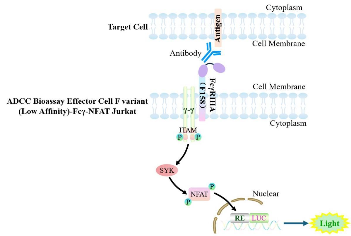 The ADCC Bioassay Effector Cell Fc Variant (Low Affinity)—Fcγ-NFAT Jurkat Reporter Gene Drug Target Model—effectively simulates the signal transduction process of ADCC *in vivo*. The underlying principle is illustrated in the figure below.