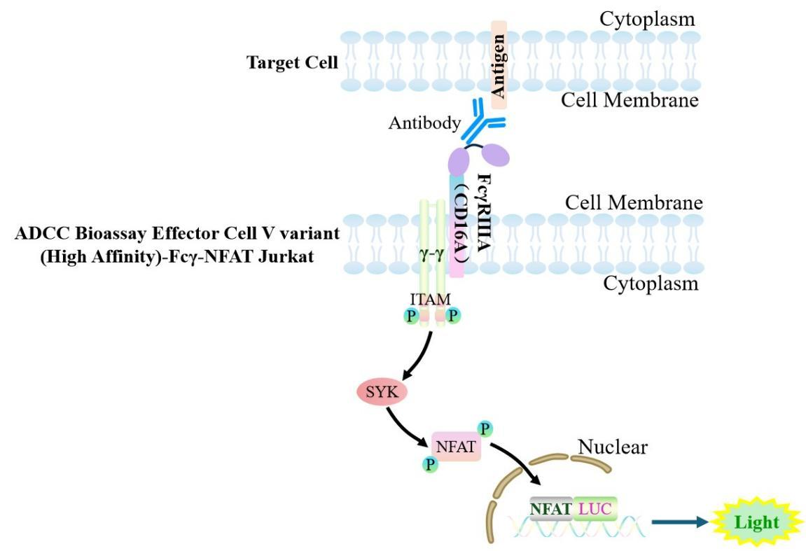 The ADCC Bioassay Effector Cell V Variant (High Affinity)—Fcγ-NFAT Jurkat Reporter Gene Drug Target Model—effectively simulates the signal transduction process of ADCC *in vivo*. The principle is illustrated in the figure below.