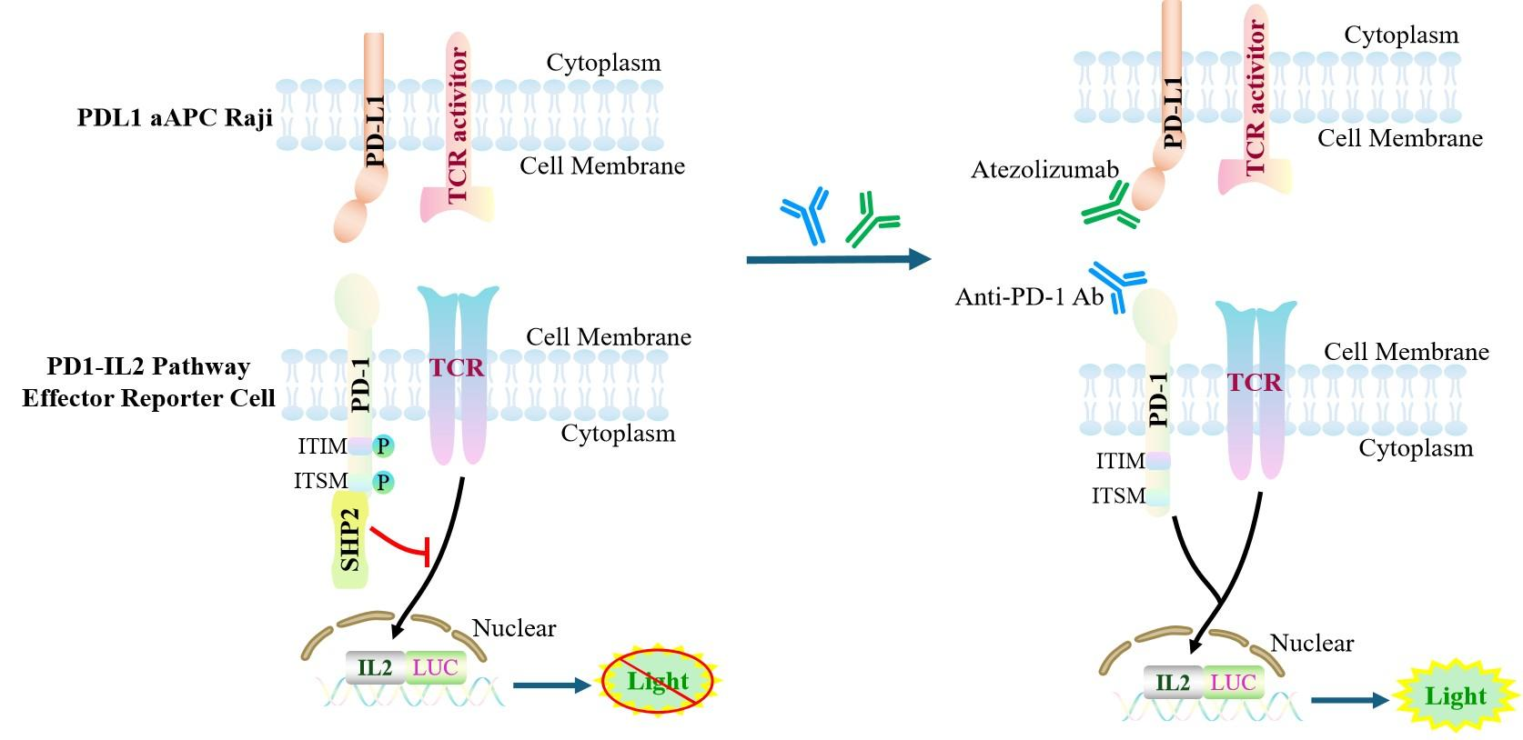 The Raji Human PDL1/aAPC Cell Model—effectively simulates the signal transduction process of PD1&PDL1 *in vivo*. The underlying principle is illustrated in the figure below.