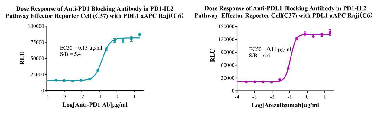 Figure 2. Dose Response of Anti-PD1 Blocking Antibody in PD1-IL2 Pathway Effector Reporter Cell(C37) with PDL1 aAPC Raji (C6). Dose Response of Anti-PDL1 Blocking Antibody in PD1-IL2 Pathway Effector Reporter Cell (C37) with PDL1 aAPC Raji (C6).
