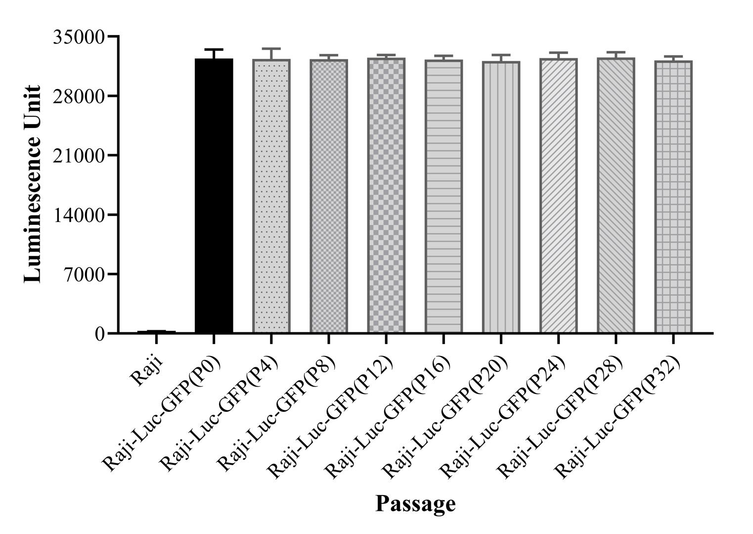 Figure 2. Stablity test results. Raji-Luc-GFP showed at least 32 passage stability with similar luminescence unit.