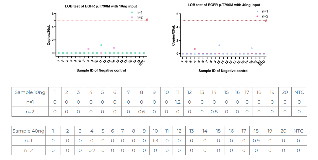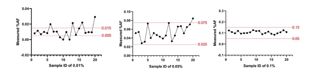 We can predict the possible detection limit range through theoretical calculation. When the control copy is within 15000 (corresponding to 50ng input), the LOB data is 2, 2/15000=0.0133%, and the predicted detection limit is 0.0200%.