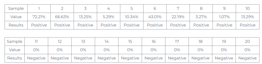 From the above data, it can be seen that under the three detection systems of strong positive 2%, medium positive 1% and weak positive 0.2%, the errors are all within a reasonable range and the precision is good.