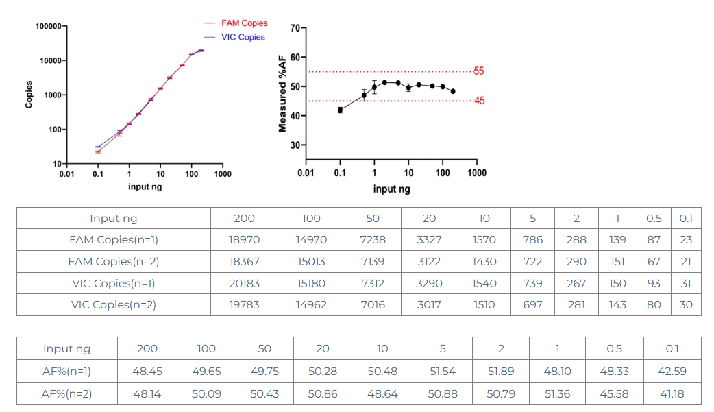 1.2 Set 10 gradients between 0.1ng and 200ng input amount, and perform digital PCR detection (2 replicates) to determine whether the fluctuation of %AF=50±10% is satisfied.