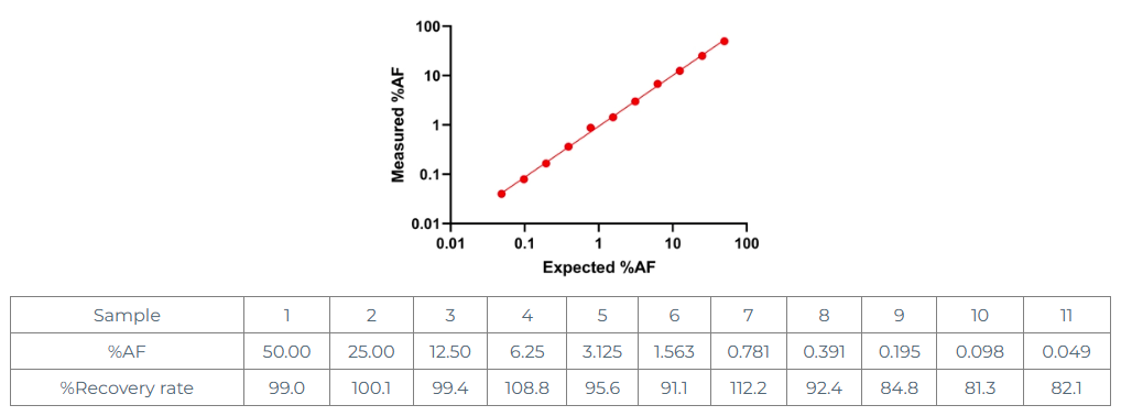 From the above data, it can be seen that when AF is in the range of 0.05%-50%, the corresponding recovery rate is in the range of 80-120%, which is in line with expectations.