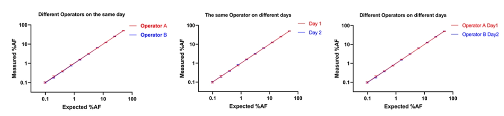 Take 10 standard samples with different AF (1%~50%) and arrange ① Operator A and Operator B to perform four experimental tests each on the same day; ② Operator A performs four experimental tests on the first day and the second day respectively; ③ Operator A performs four experimental tests on the first day and Operator B performs four experimental tests on the second day.